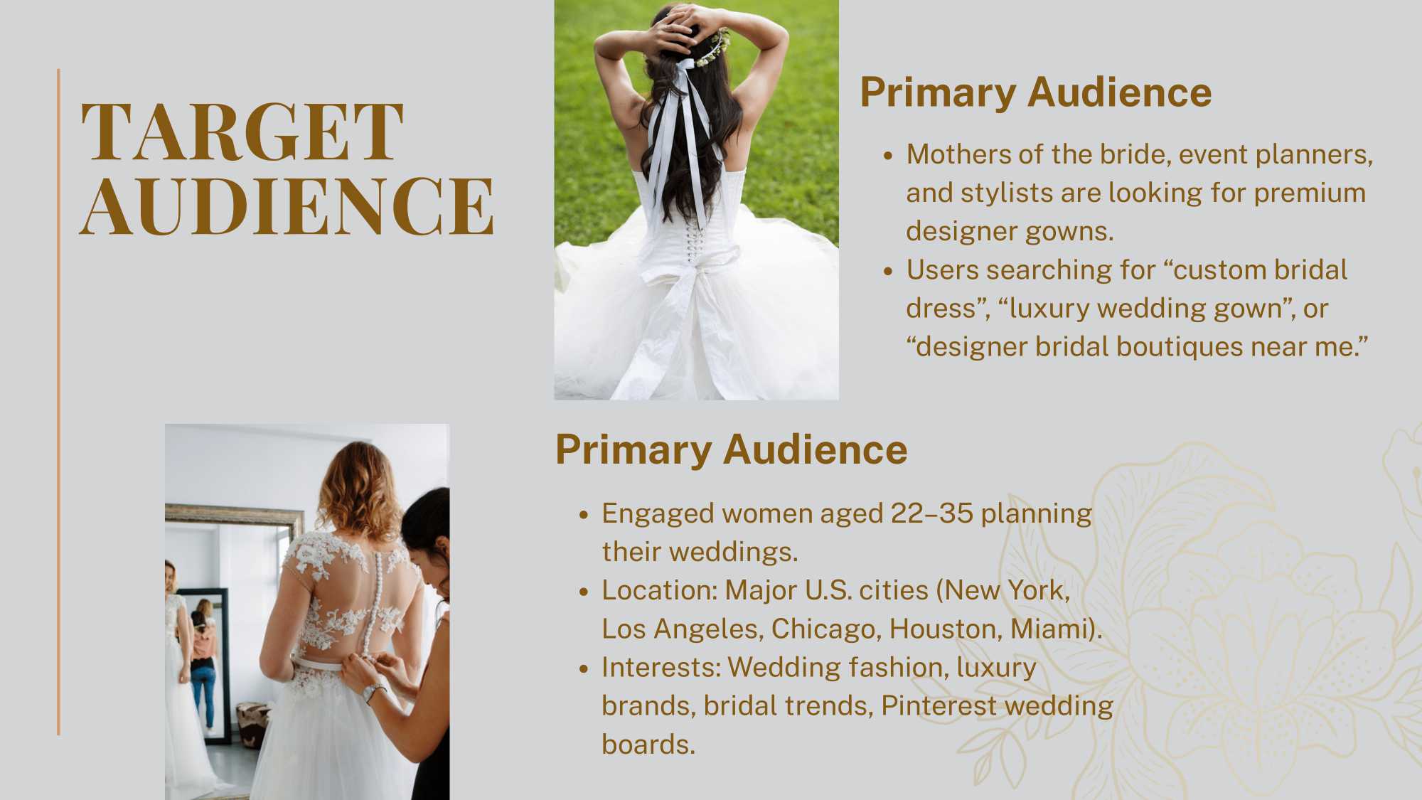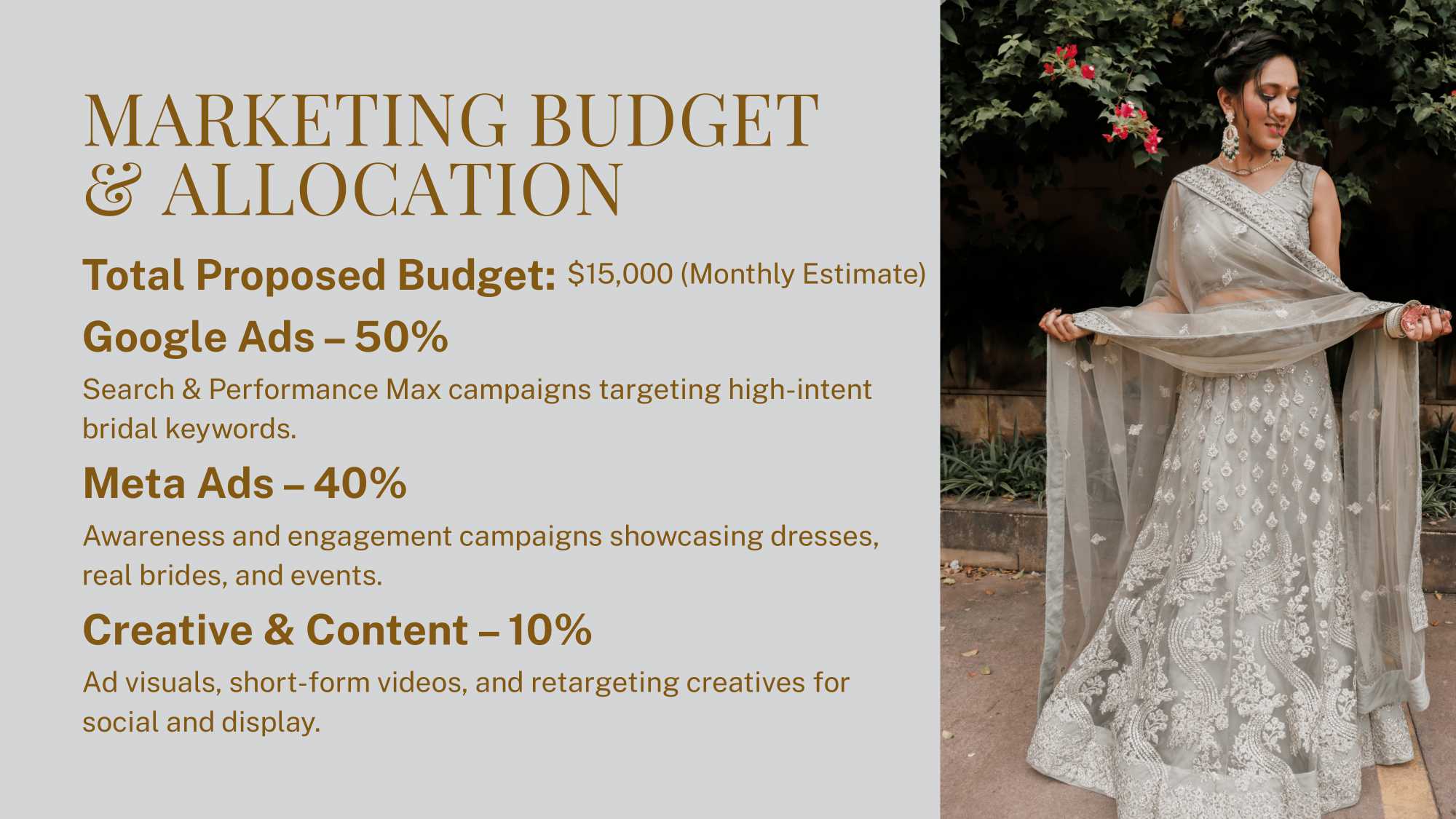 I developed a polished Social Media Launch Document outlining brand voice, persona, positioning, content categories, and engagement strategy. I also prepared Meta and Google Ads strategy planning for the brand, with the note that ads data cannot be publicly shared due to confidentiality. The plan ensured the brand spoke to brides in a modern, aspirational, and premium tone.