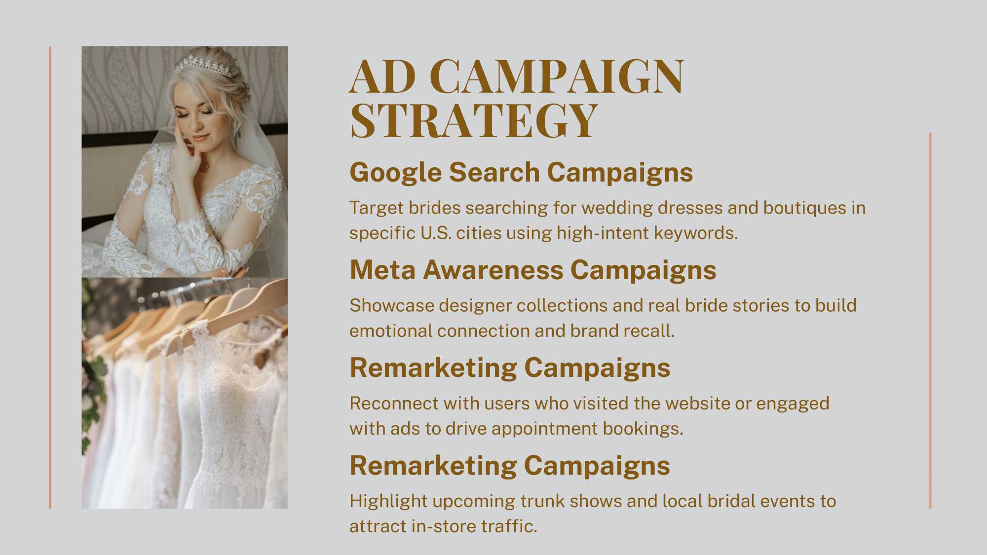 Crafted a refined social media launch document defining brand voice, pillars, and engagement strategy. This gave all store locations a cohesive, modern, and aspirational identity that resonates strongly with today’s brides across every touchpoint.