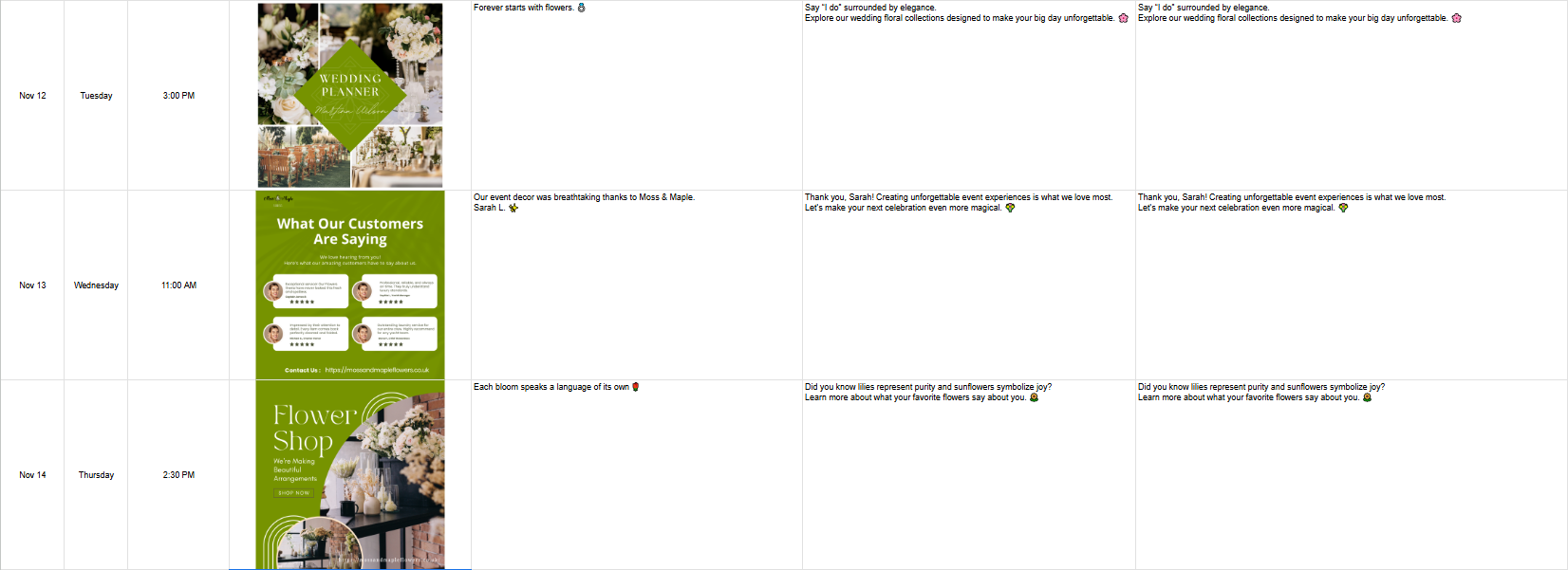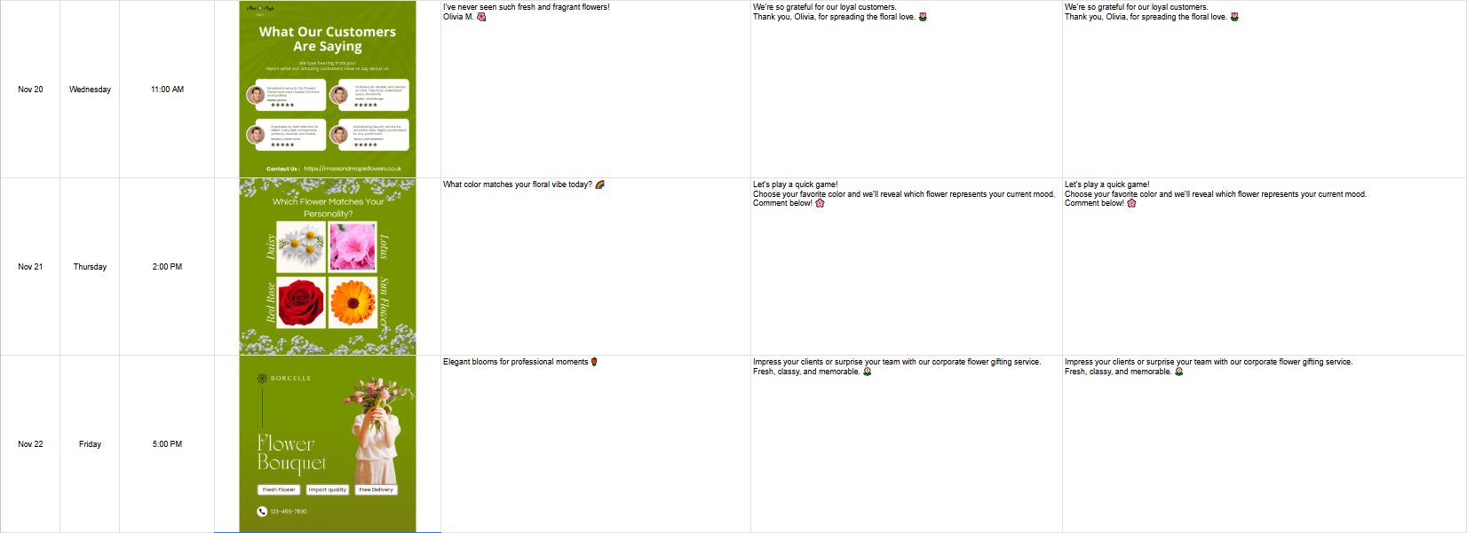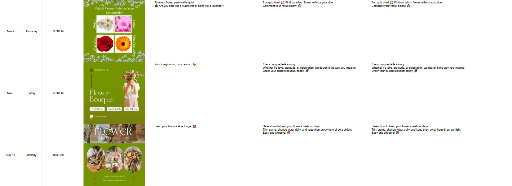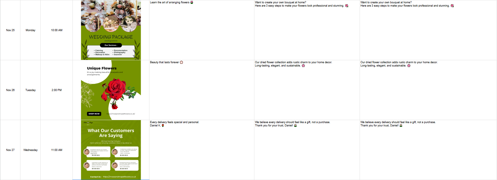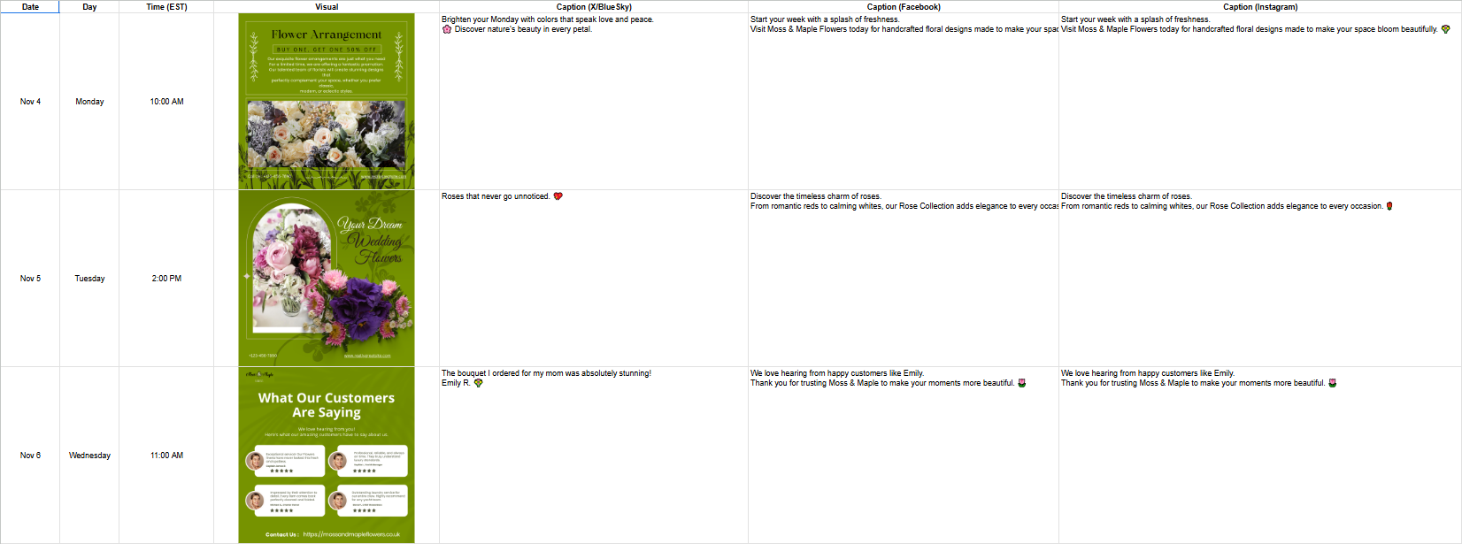 I developed a complete Social Media Launch Plan, detailed Content Strategy, and a structured 30-day Content Calendar. I also handled their Meta Ads and Google Ads campaign setup. Campaign data and detailed configurations are not shared publicly in respect of privacy and brand confidentiality. The content system included product-focused visuals, floristry storytelling, testimonials, and platform-specific captions for Facebook, Instagram, and X.