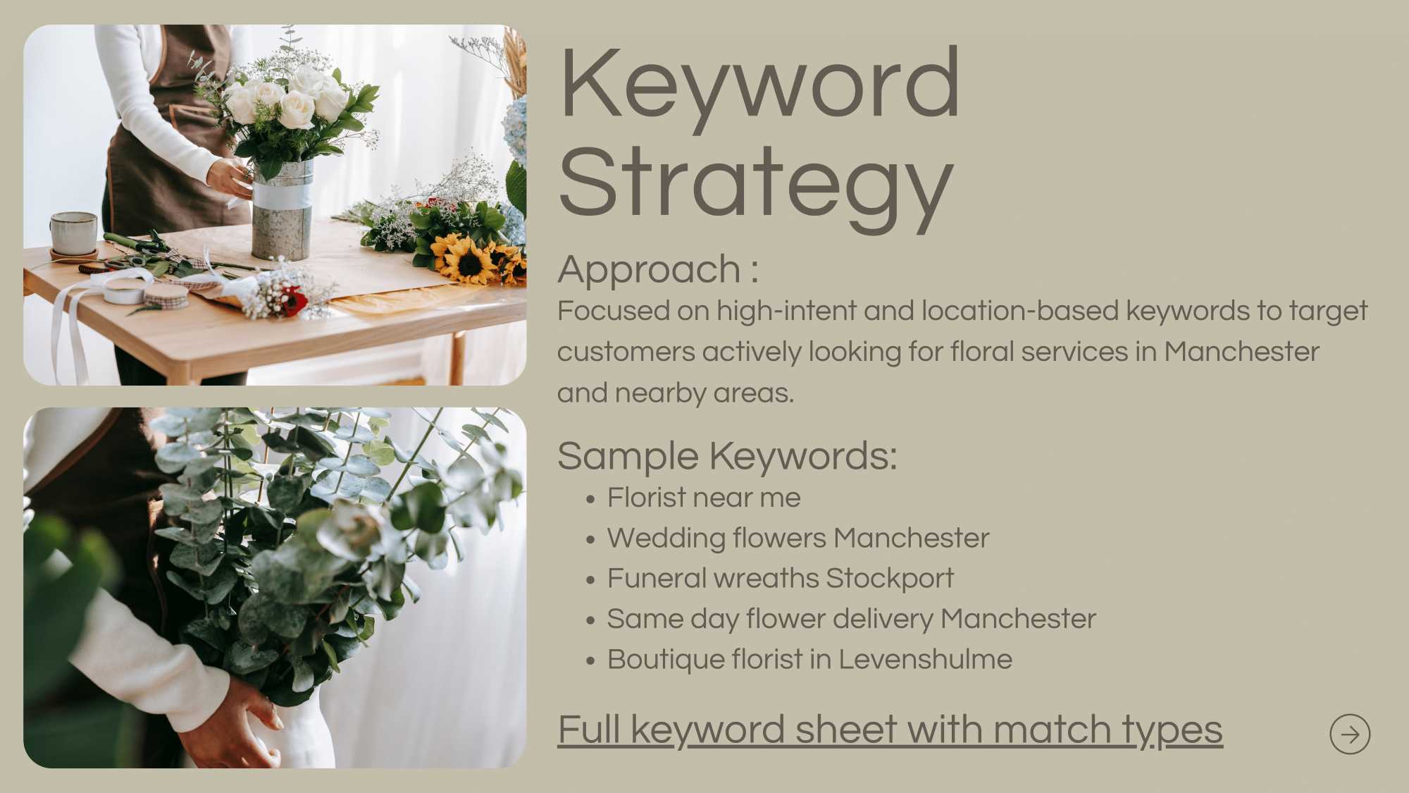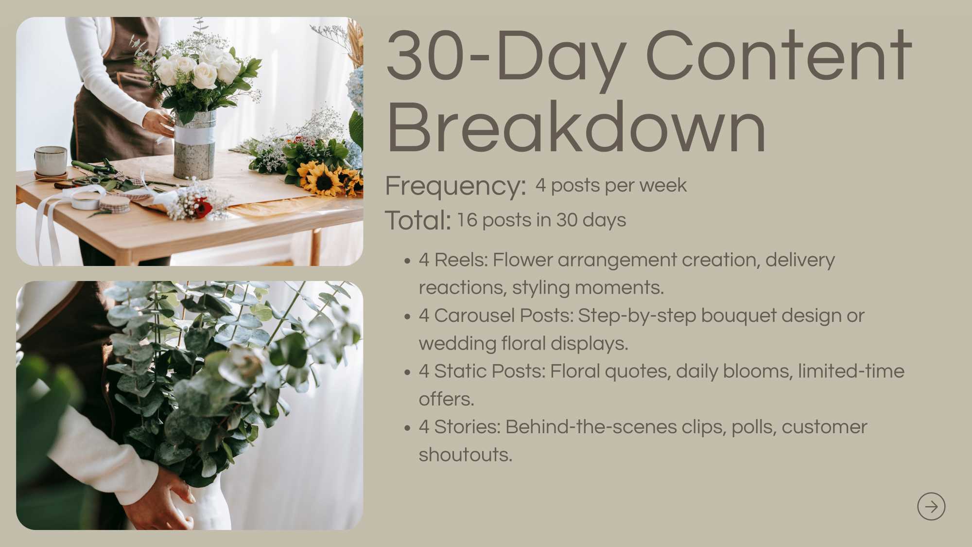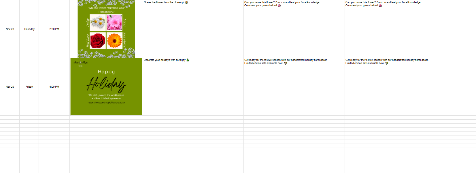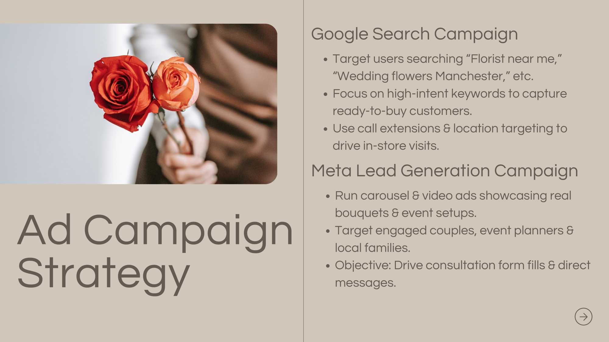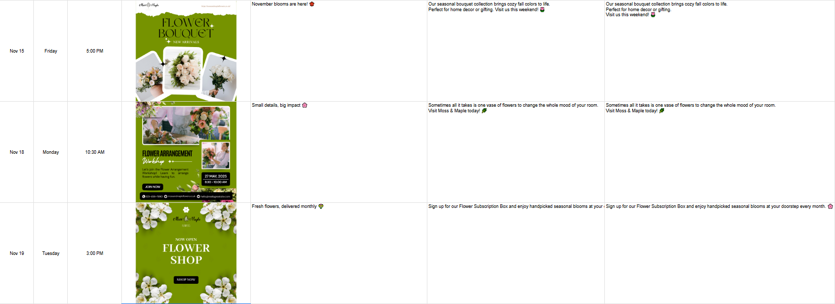 I developed a complete Social Media Launch Plan, detailed Content Strategy, and a structured 30-day Content Calendar. I also handled their Meta Ads and Google Ads campaign setup. Campaign data and detailed configurations are not shared publicly in respect of privacy and brand confidentiality. The content system included product-focused visuals, floristry storytelling, testimonials, and platform-specific captions for Facebook, Instagram, and X.
