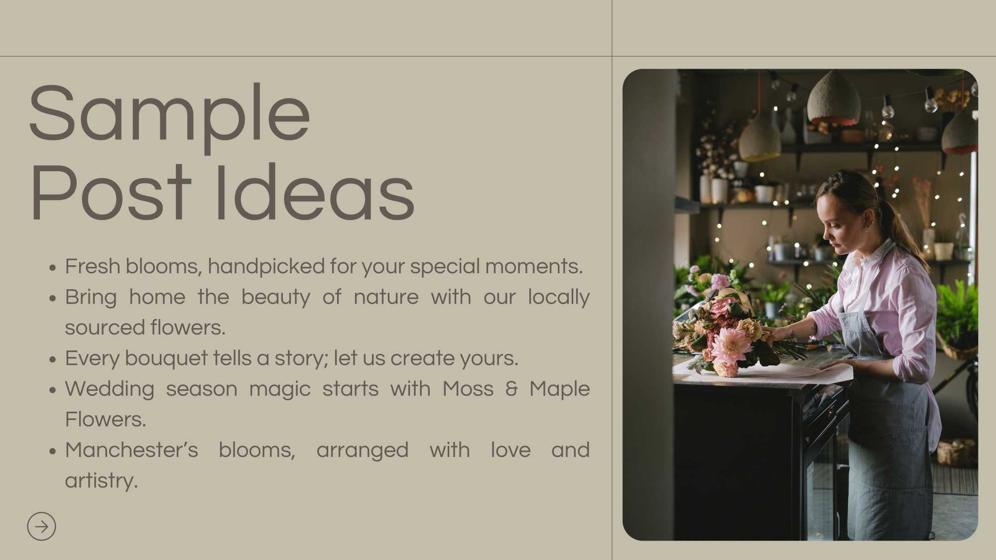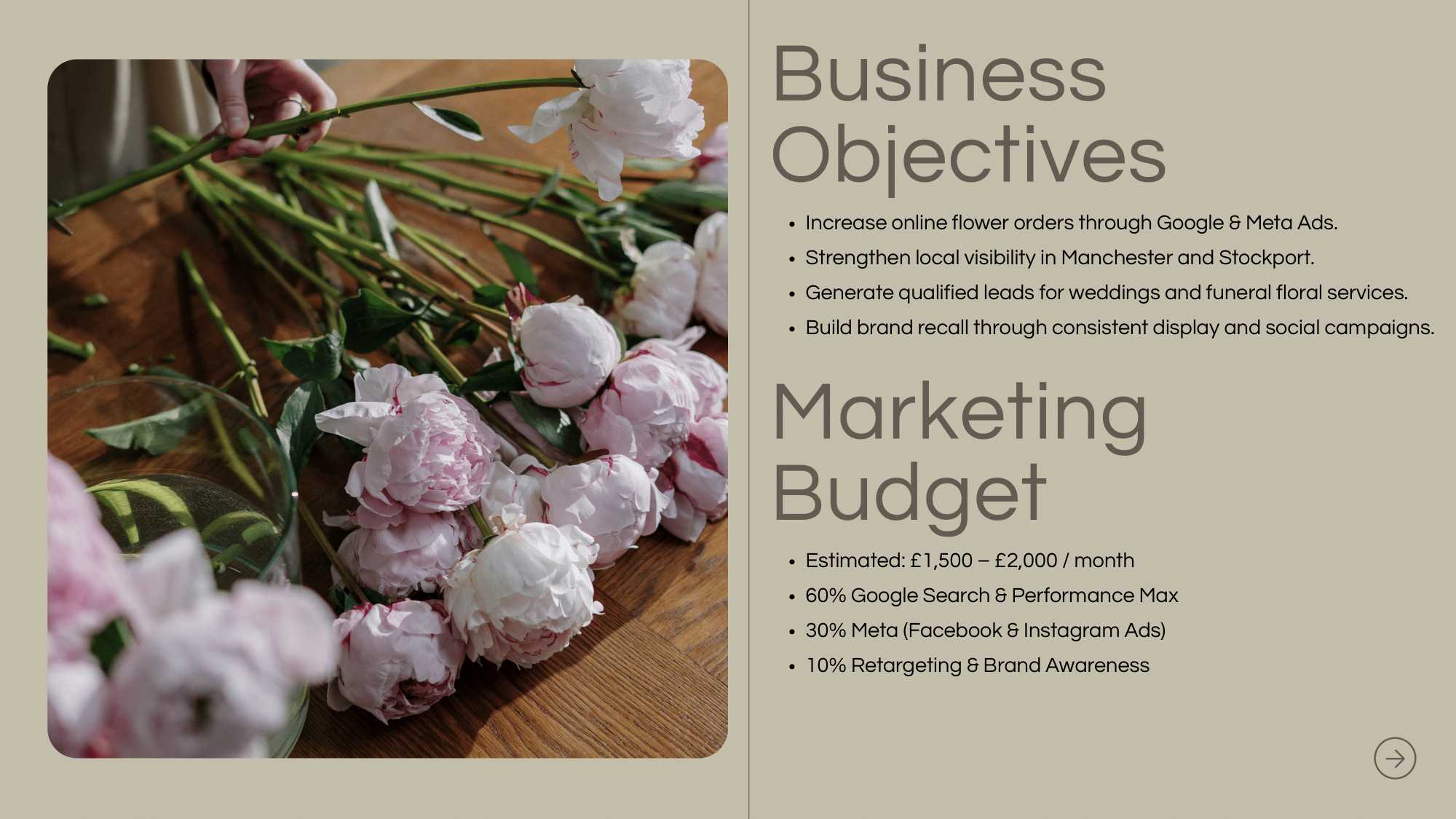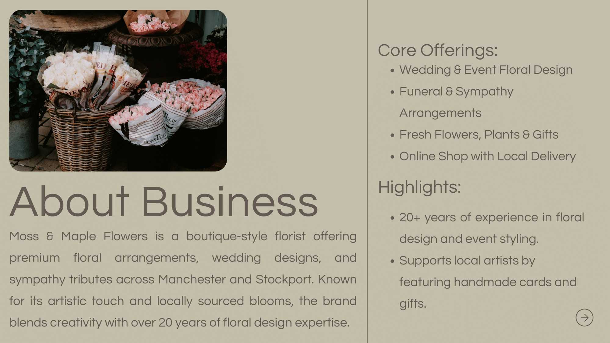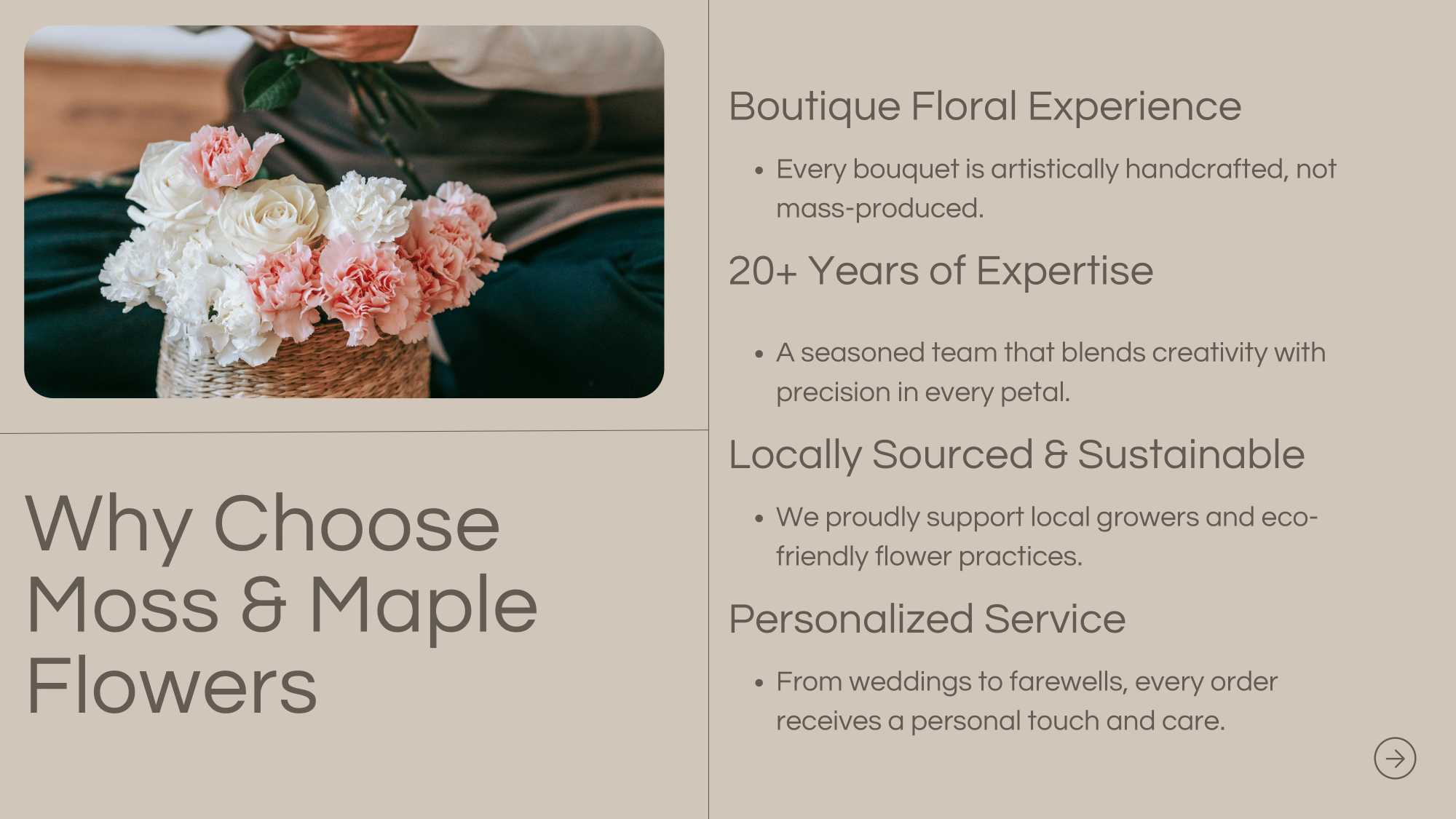 Moss & Maple Flowers is a local floral boutique offering premium bouquets and custom arrangements. They wanted a polished, consistent online presence to attract local customers and strengthen their brand identity.